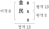 원격 : 05수 定成格(정성격) 형격 : 13수 智謀格(지모격) 이격 : 08수 開物格(개물격) 정격 : 13수 智謀格(지모격) |
